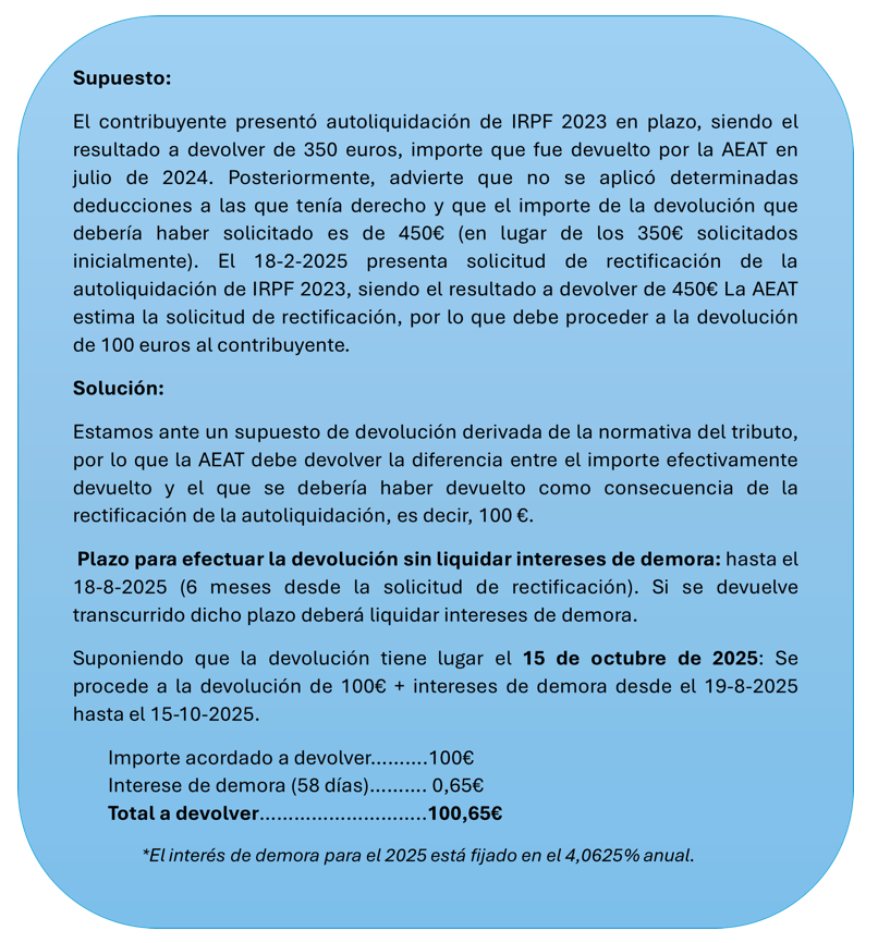 En estos casos, la Administración solo está obligada a abonar intereses de demora si no ordena el pago en el plazo de seis meses desde la presentación de la solicitud de rectificación (cuando la rectificación tenga lugar transcurrido el plazo para presentar autoliquidación). Si la rectificación se insta antes de que transcurra el plazo para presentar autoliquidación, el plazo de 6 meses que tiene la Administración para devolver sin intereses comienza a contarse a partir de la finalización del plazo para la presentación de la autoliquidación.